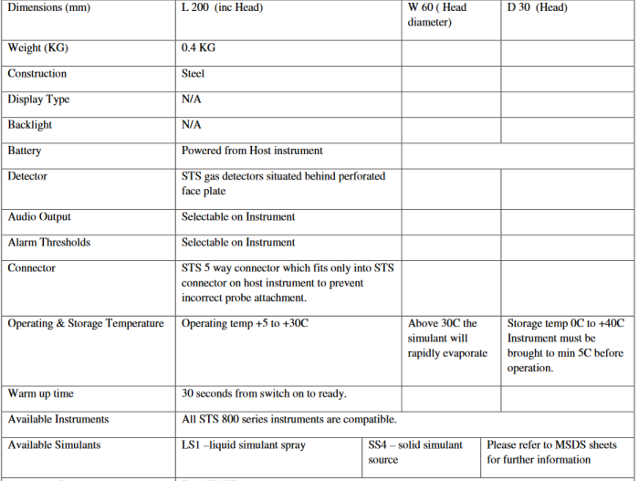 The STS HP260 is a replica of a real pancake probe , but with a STS gas detection head rather than a real detector. STS electronics installed within the host instrument power the gas detection system and the signal generated is displayed on the host instrument as counts. The Probe detects the presence of the STS LS1 liquid stimulant spray placed on surfaces and clothing.