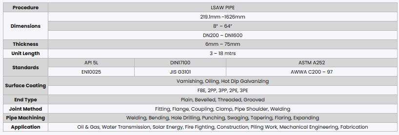 Our LSAW pipes are produced using the Longitudinally Submerged Arc Welding procedure, ensuring a strong and durable product. These pipes are available in various dimensions and steel grades, each meeting rigorous production standards. The surface coatings applied enhance their durability and resistance to corrosion. The end types and joint methods can be customized to meet specific application requirements. These pipes are machined to perfection and find extensive applications in industries like oil and gas, and water supply.