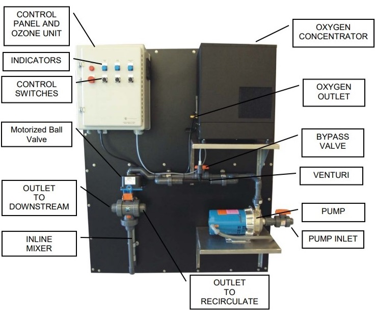 High output ozone generation units provide up to 240 g/hr of ozone in either a circulation or aeration format for the reduction of organics, BOD and COD, coagulation of solids and destruction of bacteria.