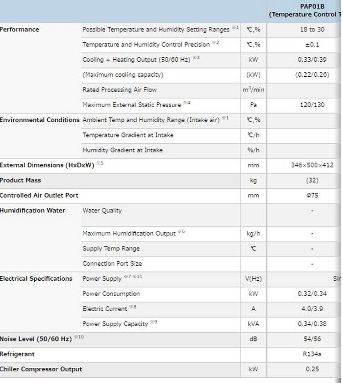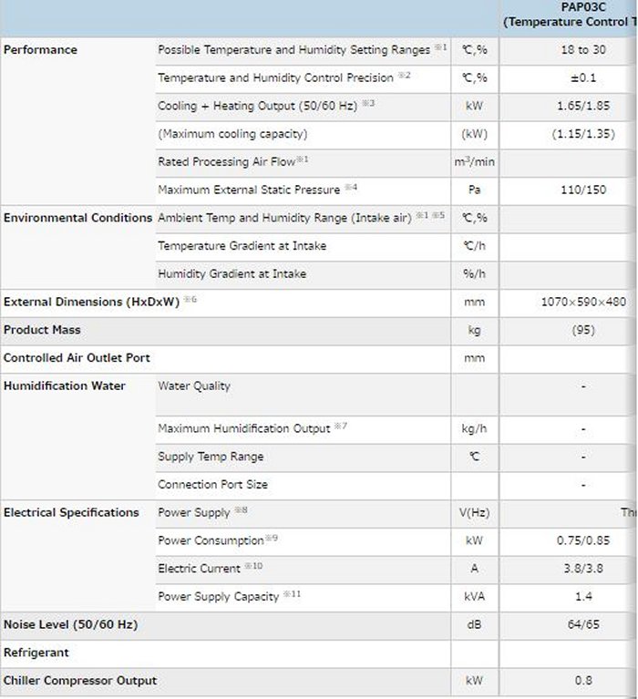 Air Processing Capacity : 0.7 to 4.0 m3/min. Humidity Control Precision : ±0.1℃. Temperature Setting Range : 18 to 30℃. Humidity Control Precision : ±1% ※KJ models only. Possible Humidity Setting Range : 45 to 75% ※KJ models only.