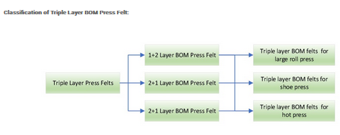 Three-layer BOM papermaking press felts include 1+2 composite, 2+1 composite and 1+1+1 composite three-layer BOM papermaking felts. The press felt can adapt to the linear pressure above 200kN/m, has the characteristics of good elasticity, good water filtering performance, can effectively eliminate all kinds of marks, stable size, long service life and so on. It is suitable for vacuum compound press of medium and high-speed paper machine, large wheel through blind hole press, shoe press and other types of press. Used for making all kinds of high-grade newsprint and cultural paper. Hanging panel paper. Jammed paper and other paper types.