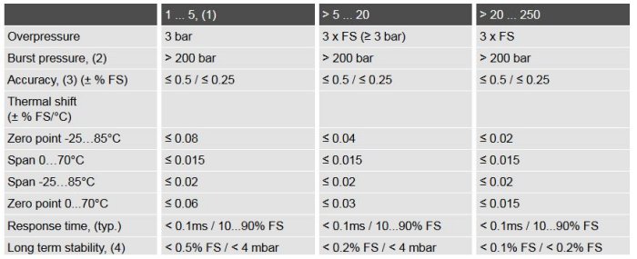 Barometric or negative pressure ranges availableFeatures. Pressure measuring range: 1…250 mH2O. Accuracy: ≤ ± 0.50 / 0.25 % FS. Operating temperature: -5…80 °C. Process temperature: -5…80 °C. Output signal: mV. Materials: Stainless steel, Titanium.
