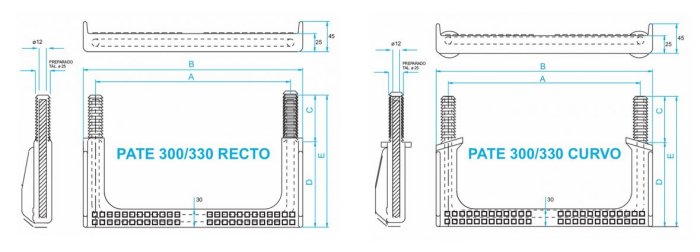 Drill two holes with a heavy hammer drill (85mm. depth), using a 25mm 0 broach. The distance between the center of the holes is 330,320 or 300mm depending on model). Introduce the Pate hitting alternatively in both sides of it with a big size nylon hammer.