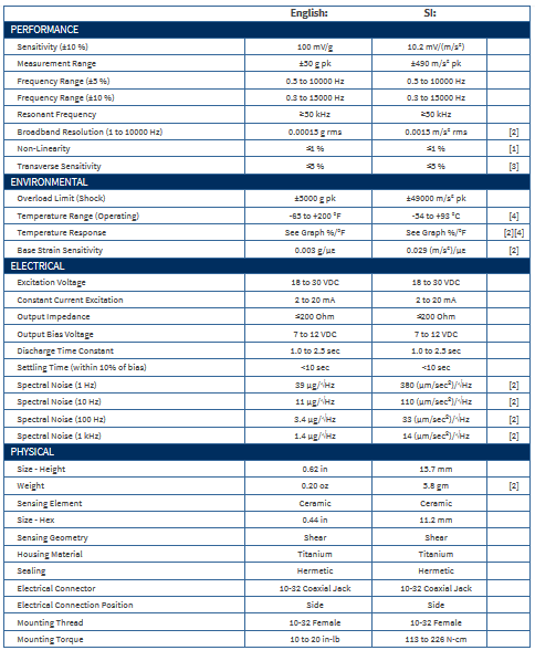 Platinum Stock Products; High sensitivity, ceramic shear ICP® accel., 100 mV/g, 0.5 Hz to 10k Hz, 10-32 side conn.