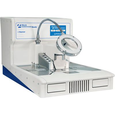 The PELCO Dispenser™ dispenses paraffin and provides paraffin management. It is also the control module which contains the control center for the PELCO Embedding Studio™ as a whole. At the top right side of the module is an easy to program touchscreen control panel for setting days of the week, start time, stop time, and temperature. The 3.8-Liter paraffin reservoir is filled through the top access lid. The dispensing arm has four heated forceps holders on each side with a precise paraffin flow control knob for the dispensing nozzle. The PELCO Dispenser™ has a large heated work surface (ranging from 50°C to 75°C) to accommodate warmed embedding molds and tissue cassettes ready for embedding. This includes vertical trimming plates on both forceps holder/warmers and two horizontal trimming plates on the heated work surface. It also includes a 61 x 46mm cold spot (ranging from -5°C to 5°C) for tissue orientation with any size of embedding mold.
