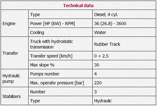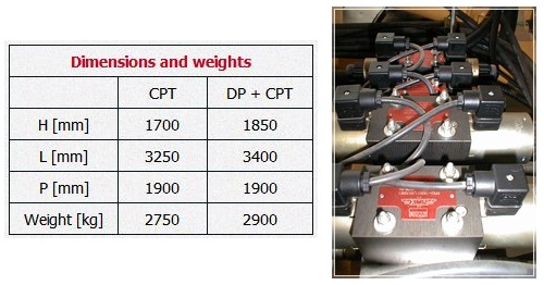 CPT: Maximum working pressure [bar] 220. Pushing force [kN] 200. Pulling force [kN] 250. Downward unloaded rate [cm/sec] 0 ÷ 16. Upward unloaded rate [cm/sec] 0 ÷ 11. Stroke [mm] 2000.
