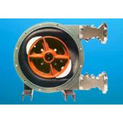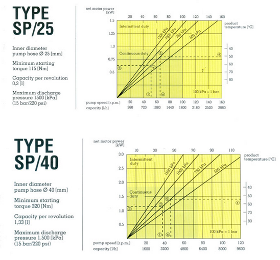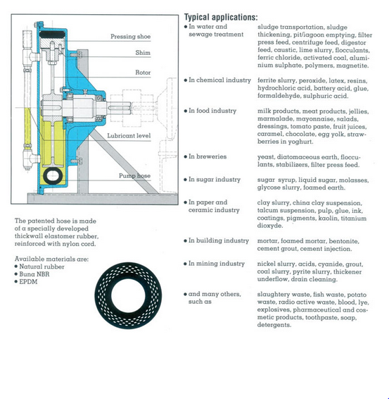 A composite, reinforced hose is enclosed within a casing that is flanged at both ends. The flanges are connected to the suction and discharge lines of the system. Within the casing is a rotor with two pressing shoes at opposite points about its centre line and mounted on a shaft with two bearings. As the rotor rotates, the hose is totally compressed by the shoes and the product within the hose is pushed forward. At the front of the pump is a removable cover with inspection window and level indicator. The pump casing is filled to approx. half way level with a specially compounded (food grade) lubricant which functions as a coolant as well. The patented hose is constructed from rubber laminations with an internal reinforcement which ensures that compression forces are evenly applied across its full width.