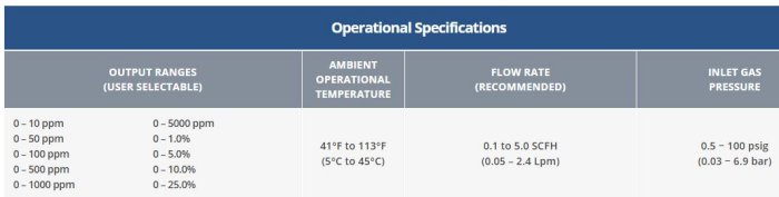 - Very rapid response time from air to low ppm levels.