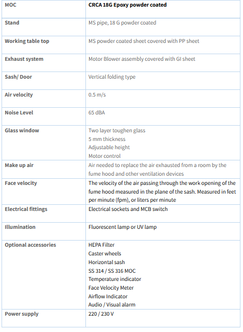 Perchloric Acid Fume Hoods are designed particularly for the process involving the use of perchloric acid. The fume hood system has entire work surface, an inner water wash down system and built in drain trough provided for detailed cleaning of the hood interior. Perchloric acid is incompatible, and might react vigorously, with a variety of organic, flammable and combustive materials, such as wood, rubber, paper and greases.