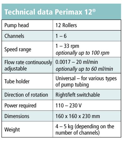 The Perimax peristaltic pump is used in all branches of analytical and preparative chemistry, and in production systems: