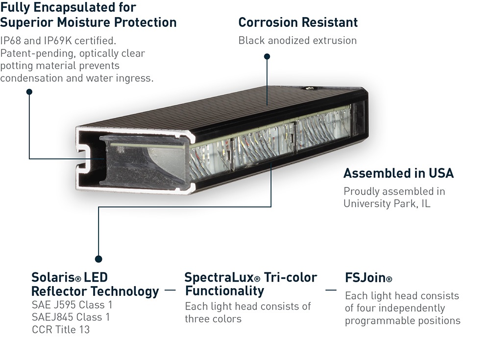 All DynaFlare® models are FSJoin® compatible, allowing full integration with Federal Signal light bars and warning systems. When connected to a Convergence Network siren or controller, operators can manage all lighting functions—including flash synchronization, dimming, and pattern control—through a single, unified interface. This simplifies fleet programming, reduces maintenance time, and ensures consistent warning performance across the entire fleet.
