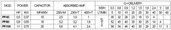 Cast iron monoblock centrifugal surface electric pumps with varied performances for clean water and similar liquids. Casing and bracket are made in cast iron, motor is in aluminium case, noryl-brass-cast iron impellers, standard mechanical seal in NBR/carbon/ceramic and shaft in quality s/s. Max water temperature 45°C tor pumps with plastic parts in touch with water and about 100°C for others. Suction 4/5 mt (8/9 mt for self-priming pumps). Induction 2 poles motor, continuative service, self-cooling protection IP44 and class F insulation. Single-phase mod. have a permanent split condenser and a thermo-amperometric protection. Standard voltages 230V-50 Cy (single-phase), 230/400V-50 Cy (threephase till 4 Kw) and 400/690V-50 Cy (three-phase over 5.5 Kw). Special voltages and executions on request.