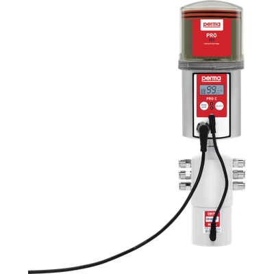 The user can select LC unit sizes 250 cm³ and 500 cm³. Each perma PRO can be programmed for lubricant discharge in days, weeks or months, up to a maximum dispensing period of 24 months. The MP-6 distributor supplies up to 6 lubrication points directly without pressure loss (max. 25 bar) and enables the use of tube extensions up to a length of 5 m. perma PRO C MP-6 can also be operated in IMPULSE mode. The impulse for a lubricant discharge can be PLC controlled. Power is supplied via the machine and can be PLC monitored and controlled.