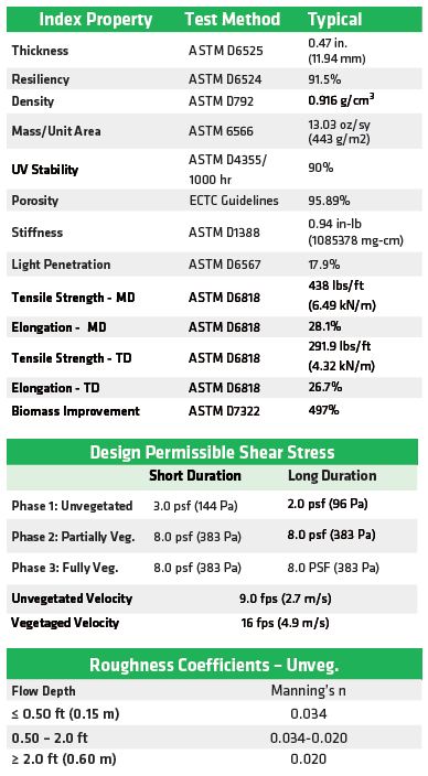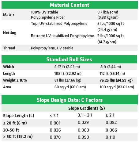 The permanent erosion control blanket shall be a machine-produced mat of 100% UV stable polypropylene fiber. The matting shall be of consistent thickness with the synthetic fibers evenly distributed over the entire area of the mat. The matting shall be covered on the top side with black heavyweight UV-stabilized polypropylene netting having ultraviolet additives to delay breakdown and an approximate 0.50 x 0.50 inch (1.27 x 1.27 cm) mesh. The bottom net shall also be UVstabilized polypropylene with a 0.63 x 0.63 inch (1.57 x 1.57 cm) mesh size. The blanket shall be sewn together on 1.5 inch (3.81 cm) centers with non-degradable thread. All mats shall be manufactured with a colored thread stitched along both outer edges as an overlap guide for adjacent mats. The P300 shall meet Type 5A, 5B, specification requirements established by the Erosion Control Technology Council (ECTC) and Federal Highway Administration’s (FHWA) FP-03 Section 713.18.