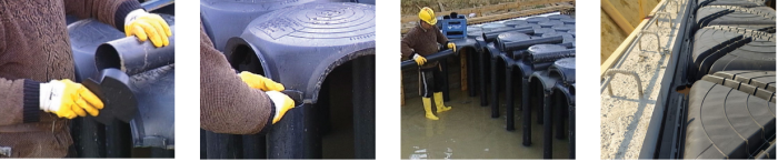 The Atlantis formworks are simple to install: the procedure consists of inserting the pipe into the slip-on base and then linking the Atlantis formwork to the far end of the pipe using the bayonet coupling. Each piece can be hooked to the adjacent piece thanks to the shaped grooves for the male/female linking. For this, simply position them in horizontal rows from the left to the right, with the arrow on the top turned outward from the operator, proceeding to the end of each row.