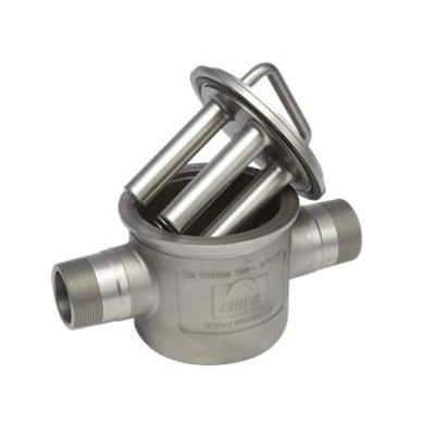 For 2" (51 mm) through 4" (102 mm) Pipelines. The magnetic element, consisting of a group of magnetic tubes, is arranged to cause the material flow entering the body to impinge against the tubes and filter through the magnetic field, completely covering the open area. This arrangement takes advantage of the material change in direction and the difference in inertia between the unwanted iron and the material carrying it. The magnetic circuit is designed so the entrapped iron will have a tendency to work around and cling to the down–stream side of the tubes. This action prevents iron particles from being washed off by the continuous flow of material.