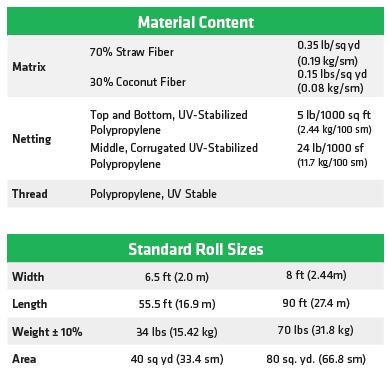 The composite turf reinforcement mat (C-TRM) shall be a machine-produced mat of 70% straw and 30% coconut fiber matrix incorporated into permanent three-dimensional turf reinforcement matting. The matrix shall be evenly distributed across the entire width of the matting and stitch bonded between a heavy duty UV stabilized nettings with 0.50 x 0.50 inch (1.27 x 1.27 cm) openings, an ultra heavy UV stabilized, dramatically corrugated (crimped) intermediate netting with 0.5 x 0.5 inch (1.27 x 1.27 cm) openings, and covered by an heavy duty UV stabilized nettings with 0.50 x 0.50 inch (1.27 x 1.27 cm) openings.