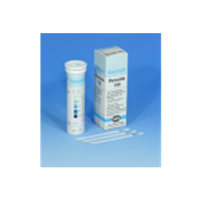 Pack Size: box of 100 strips. Hazard Class /UN Number: Not Restricted. Storage Temp: Room Temperature. Test sticks for the semi-quantitative determination of hydrogen peroxide (H 2 O 2 ) and peroxides in solutions. Gradation of scale: 0-1-3-10-30-100 mg/l H 2 O 2 white to blue. QUANTOFIX « Peroxide is also suited for the determination of other inorganic and organic hydroperoxides. For the determination of hydroperoxides in organic solvents the test field is moistened with a drop of water after evaporation of the solvent. Between pH 2 and 9 the reaction is independent of the pH value of the test solution. Strongly acidic solutions should be buffered with sodium acetate, alkaline solutions are adjusted to pH 5 to 7 using citric acid. Strong oxidizing agents interfere.