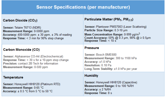 - Measures CO, CO2, PM1, PM2.5, temperature, pressure and relative humidity