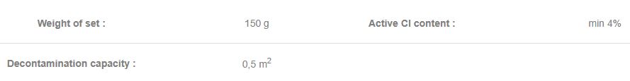 - PVC sack containing all necessary chemicals, decontamination effect based on chlorine. The sack is designed for mixing the chemicals with the prescribed amount of water to make the solution.