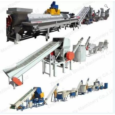PET bottle recycling machine mainly includes belt conveyor, label removing machine, belt conveying picking table machine, crusher, washing tank, hot water washing tank, frictional machine, washing and separating tank, dehydrator, storage bin, bagging machine. This plastic recycling line is for dealing with PET waste bottles. Through the whole process of removing labels, crushing bottles to flakes, washing flakes, and dehydrating, the PET bottles will become clean PET flakes.
