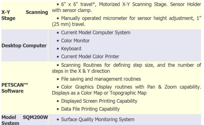 The SQM500W is a fully integrated 3-D color graphics data computer, a motorized X-Y scanning stage (6" X 6" Travel) with 2-Axis controller, color printer and a SQM200W Surface Quality Monitor. All scanning and data acquisition is controlled by PETSCAN™ software.
