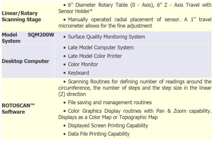 SQM600W is a fully integrated 3-D color graphics data acquisition system. The standard SQM600W system includes a late model desk top computer, a motorized linear/rotary scanning stage, 2-Axis controller, Color Printer and an SQM200W Surface Quality Monitor. All scanning and data acquisition is controlled by ROTOSCAN™ software.