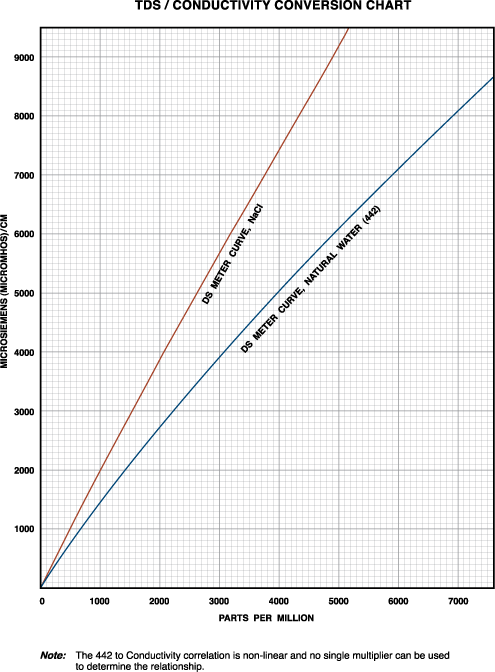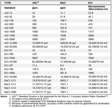 Myron L conductivity instruments and monitor/ controllers are calibrated to read in ppm/442, ppm/ NaCI, or microsiemens. All three values are listed on our Standard Solutions. The relationship among these standards can be seen in the table and graphs that follow.