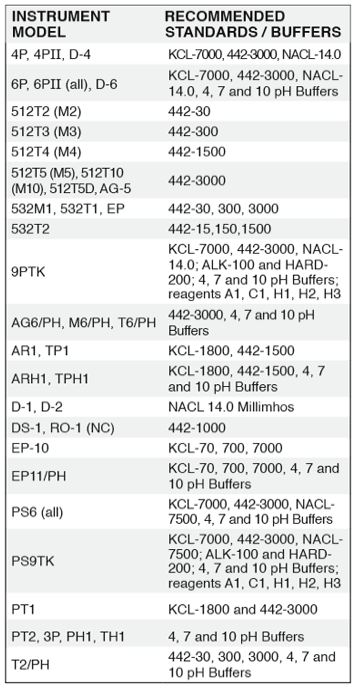The conductivity Standard Solutions and pH Buffers listed below are used for factory calibration. Regular use of these solutions is recommended to ensure specified instrument accuracy. Frequency of conductivity recalibration depends upon use, but once every month should be sufficient for an instrument used daily. pH models, depending upon use, should be recalibrated with pH 7 Buffer every 1-2 weeks, and checked with pH 4 and/or 10 Buffers at similar intervals. pH Sensor Storage Solution is recommended for keeping the pH sensor wet. Myron L solutions are available in quart/1 ltr., gallon/3,8 ltr. and 2 oz./59 ml plastic bottles, ready to use. (Custom value standards only offered in gallon/3,8 ltr. size bottles.)