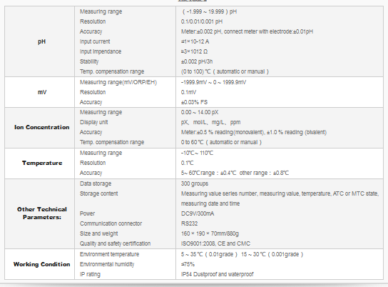 - Automatically recognize 13 kinds of pH buffer solution. User can choose anyone from four series of standard buffer solutions: Europe & USA series, NIST series, CHINA series and Self-defined series