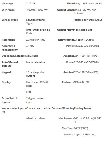 - Controller can be removed from a cooling tower and be placed in another type of application when used with the appropriate pH or ORP sensor.