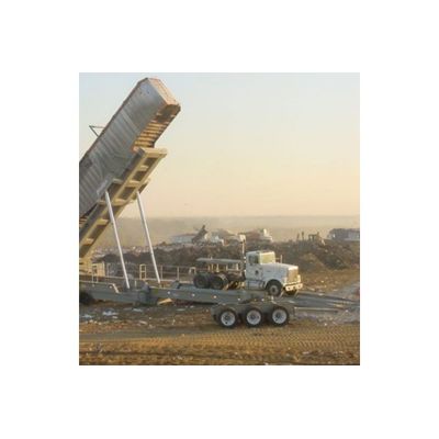 The Phelps Low Profile Landfill Trailer Tipper is designed for over-the-road transportation, when several major components are unpinned and removed comprising a second trailer load. Tipper is designed to raise itself in front for coupling to a truck/tractor or converter dolly for relocation in the landfill. Time required for in-the-cell relocation is approximately fifteen minutes. This ease of movement is critical to landfill operation to save the costs of long distance pushing of materials away from tipper. All portable landfill tippers utilize a self-contained diesel powered hydraulic power unit.