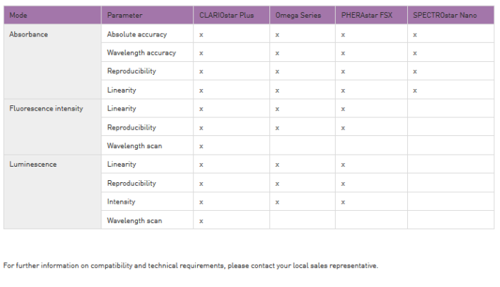 The intended use of the Evaluation Plate is the validation of the optical functionality of BMG LABTECH microplate readers for quality control and/or qualification (IQ/OQ) purposes in environments following GLP compliance. The plate is compatible with all BMG LABTECH readers listed below and is designed to simplify fluorescence intensity, luminescence and absorbance qualification tests, saving time and avoiding the use of liquid standards.