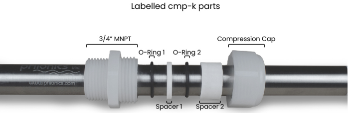 Custom-made 3/4 inch MNPT compression fitting for pipe mounting of one pHionics STs Series™ water quality sensor. Unlike compression fittings from other manufacturers, the cmp-k cannot be overtightened so there is no risk of damage to the sensor. This product is made from chemical-resistant PVDF to withstand harsh chemical conditions. Not suitable for pressurized in-line applications or temperatures above 30°C. See below for more information on proper installation of sensors using cmp-k.