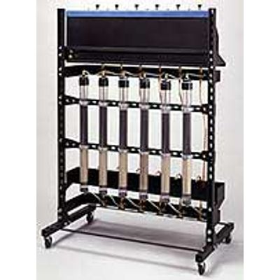 - The device consists of a number (4 or 6) of filter columns (2″ ID clear PVC) and sets of valves to control the flow of water samples from the sample B-KER2s and service water during the backwash process. All components are mounted on a portable rack with casters. The CFS mounted on the portable rack can be used in the lab or moved to a more convenient location within the treatment plant.