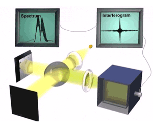 FTIR is a widely used method for obtaining IR spectra of a sample. The sample is exposed to IR radiation modulated by an interferometer and the intensity of transmitted radiation is monitored via an IR detector. At certain resonant frequencies characteristic of the specific sample, the radiation will be absorbed resulting in a series of peaks in the spectrum, which can then be used to identify the sample.