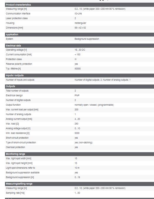 Reliable optical distance measurement with long ranges up to 10 m. Two switching outputs, one of them programmable as IO-Link and one as analog output. Scalable measuring range and window function. Use in applications with background suppression. Excellent price/performance ratio.