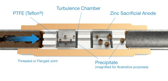 The patented construction of its PTFE (Teflon®) turbulence and zinc anode chambers alters the static balance within the unit. This neutralizes charged particles, causing them to flocculate, or form large clump particles that are slower to re-dissolve in the water.