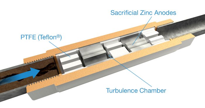 The ION ScaleBuster is constructed using a unique combination of zinc, alloy and non-stick PTFE (Teflon®), which will not lead to corrosion or blockage within the device.