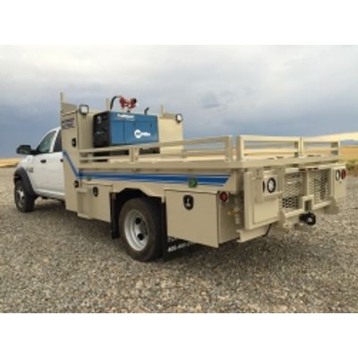 Flattank/Pickup Support Trucks - Standard Drill site Water Tank (capacity app. 950 Gallons) 114" or 9.5` of useable bed, 3/16" steel plate construction, 90" wide x 18" tall, total tank length is 12`, Weather tight tool boxes. 10 gauge steel plate material - (2) front driver horizontal boxes 48" long x 24" deep x 16" Tall.