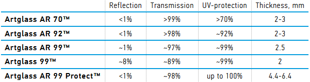 Artglass AR 70 is made invisible by being coated with metal oxide ions in one of the largest magnetron deposition systems in the world. Our advanced technology ensures that the anti-reflective layers are as thin as 1/500th of the diameter of a human hair and completely invisible to the eye.