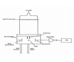 The PID uses a 10.6 eV lamp (the Ionization Potential for AsH3 is 10.6 eV )to ionize arsine (g) generated by reduction with NaBH4. When AsH3 absorbs a photon, it forms a positive ion AsH3 + plus an electron (e-). The positive ions are collected in an ionization chamber where the bias electrode pushes the ions to the collection electrode and the current collected is proportional to the concentration over a range of 107 from ppb to high ppm. A schematic of the PID is shown below.