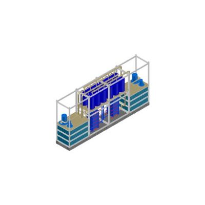 These blocks consist of two levels, whereby the lower level provides or discharges heat by means of a heat exchanger and the upper level holds six membrane modules. Piping trays are integrated on the skid for feed and discharging of the modules.