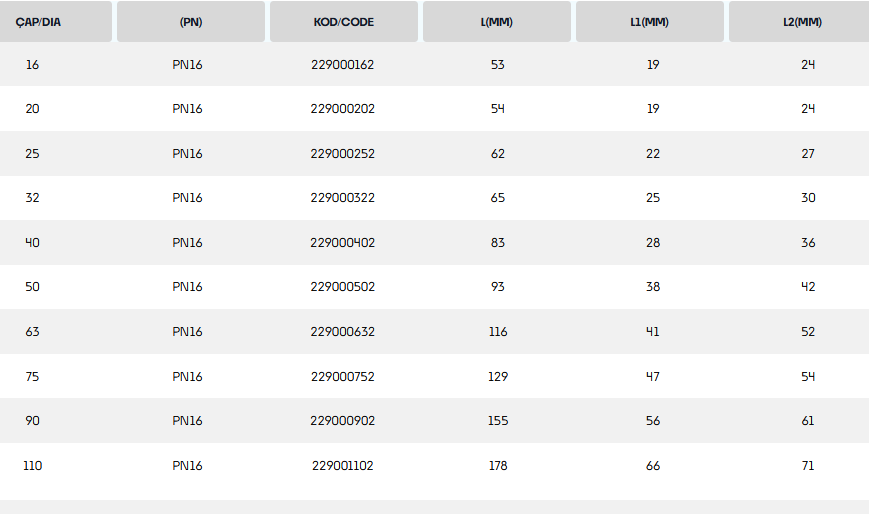 DIA : 16. PN : PN16. CODE : 227000162. L (MM) ; 53, LI (MM): 19. L2(MM): 24.