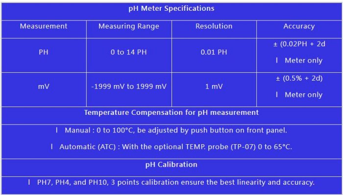 pH : 0 to 14.00 pH, 1999 mV. mV function for ORP electrode. Manual temperature compensation. ATC via optional Temp. probe (TP-07). Easy pH calibration procedures. RS232, Hold, Record (Max., Min.), oC/oF. Size : 195 x 68 x 30 mm.