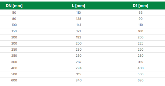 Installations for transmission of drinking water (waterworks) and other neutral liquids, fed under pressure or without it, at temperatures up to 120°C. Material of body: Spheroidal iron cast according to the norms PN-EN 545:2010. Shipping conditions: Leak test according to the norms PN-EN 545:2010. Possible embodiment of the corrosion resistant coating