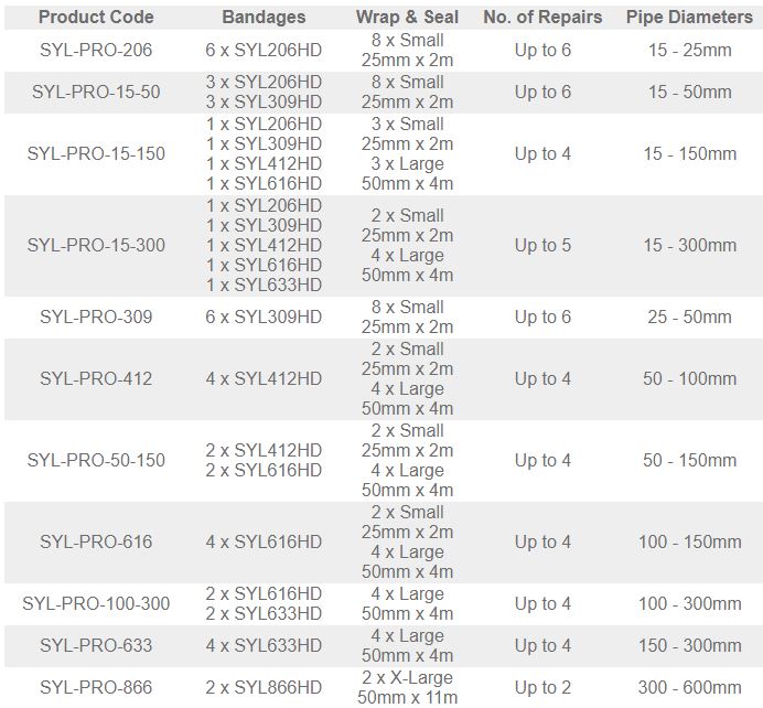 There are 11 different variations of the Contractor Case available. Each Case contains different product quantities for the repair of different pipe sizes. For an exact breakdown of what each Case contains and the pipe diameters Sylmasta recommend its use with, please see the Size Guide.