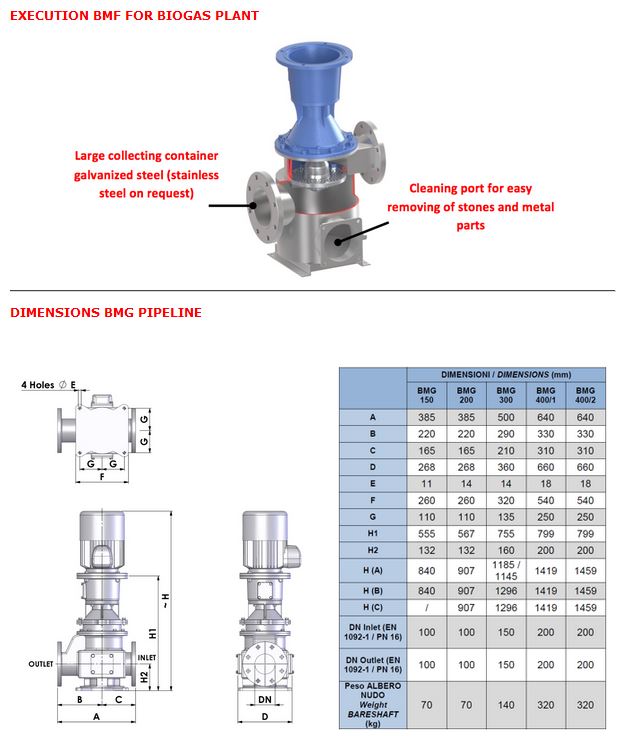 Bio-Macerator:thorough disintegration and uniform blending of the liquid phase and cosubstrate into a homogeneous biomass substantially increases the efficiency of biogas production. Bellin has developed a compact unit specifically for this purpose. By combining a positive displacement pump (which may be rotary lobe pump or progressing cavity pump) and a powerful macerator into a single unit, Bio-Macerator can prepare superior quality biosuspensions. It can simultaneously feed one or more fermenters and handle additional pumping tasks in the biogas plant when needed. With cutting blades self-compensating, self-lubricated mechanical seal in oil bath, a large collecting container galvanized steel (stainless steel on request), settling out sump for stones and metallic objects, with special opening for easy inspection and cleaning.