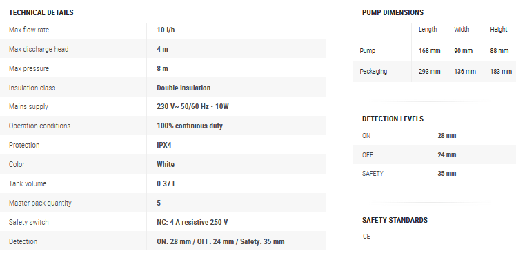 The Si-61 is a piston pump in neutral color, ideal for living spaces, with built-in tank (0,37 l) designed to remove acidic condensates from gas condensing boilers up to 50 kW. The Sauermann® technology inside the pump enables small particles removal. Together with innovative float, this technology makes the pump fully reliable in a condensing boiler environment. White color, small size and low noise level make the Si-61 ideal for an installation in a kitchen.