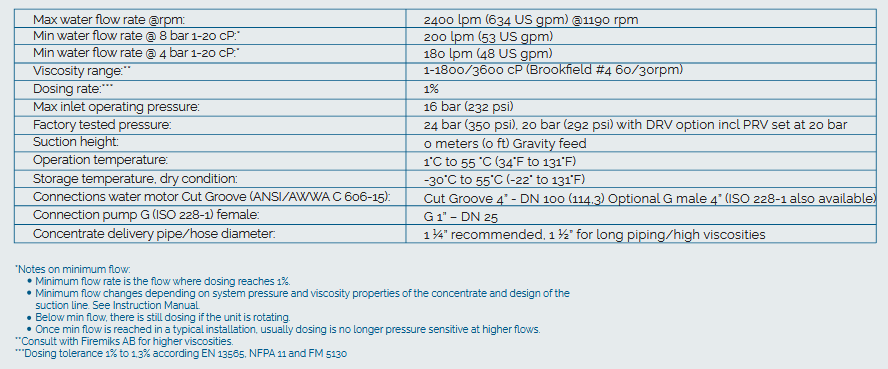 1% dosing system for firefighting - for fixed installations connected to a concentrate tank with gravity feed to the dosing piston/plunger pump. Extinguishing water drives the volumetric water motor, which in its turn drives the positive displacement concentrate piston/ plunger pump that doses the correct amount of foam concentrate in the extinguishing water exiting the water motor Equipped with a Manual air relief valve. Flushing of dosing pump is done automatically when the concentrate inlet is closed with Selector valve Dosing/ Flushing, (no 4 on Flow chart). Supplied with Flap check valve for concentrate inlet and Wrench to rotate the unit by hand at maintenance.